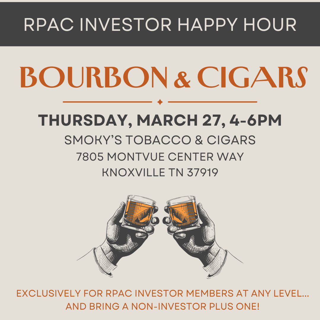 Toast to the REALTOR Party at the first ever RPAC Investors Happy Hour, on Thursday March 27 from 4-6pm! We'll enjoy a bourbon tasting and cigar etiquette experience at Smoky's Tobacco & Cigars for RPAC Investor members of any level. Investor members are encouraged to bring along a non-investor member plus one! Limited capacity event.
