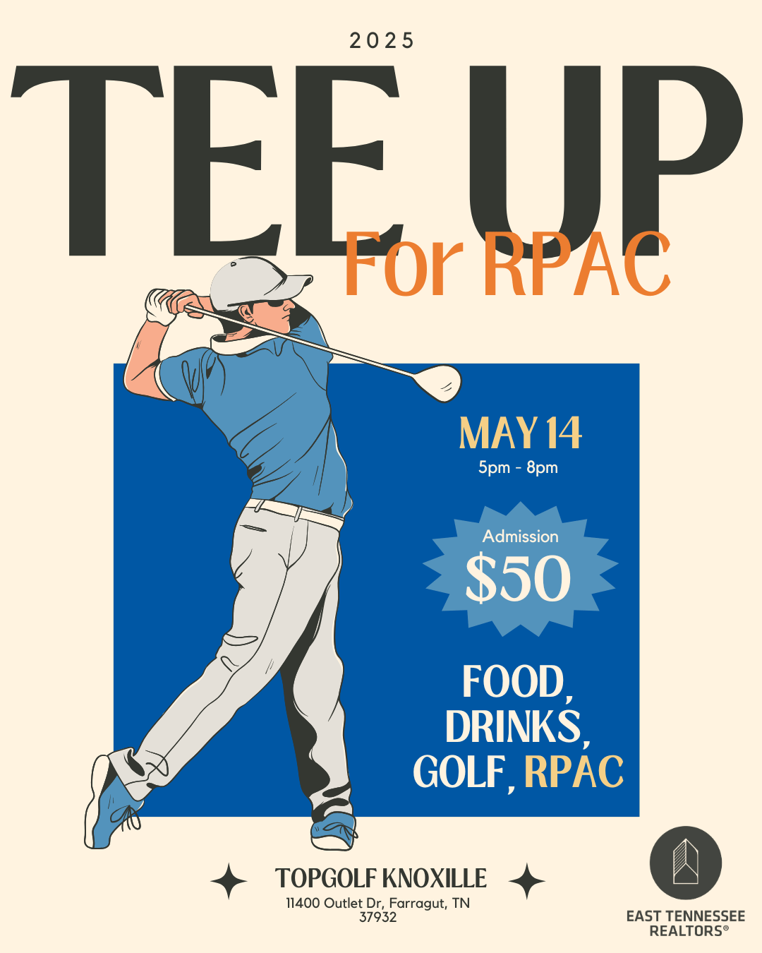 NEW DATE!!! Join us on May 14, 2025 for an evening of drinks, food, and playing golf while learning about the importance of RPAC! The event will take place at Top Golf from 5-8pm to raise funds for the REALTORS® Political Action Committee (RPAC). The evening will begin with a presentation on the importance of RPAC and how it benefits the real estate industry. Following the presentation, there will be a reception with drinks, heavy hors d'oeuvres, and the chance to play golf.